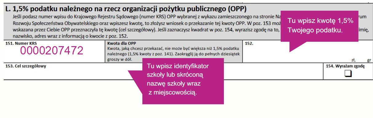 Każda placówka oświatowa biorąca udział w programie posiada indywidualny identyfikator. Wpisując go w zeznaniu podatkowym, możesz przeznaczyć 1,5% podatku dochodowego właśnie na tę konkretną placówkę.